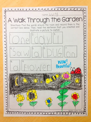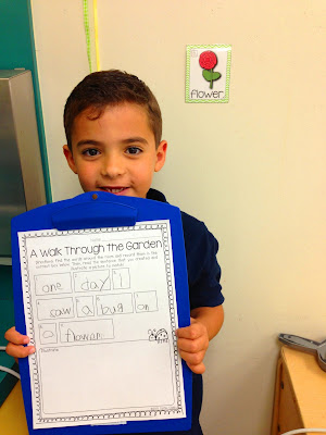 One of their centers was walking through the 'garden' and finding different words that would build a sentence. I told them that when they were finished they would be able to read a secret message...they were so excited!!