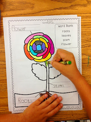 We have also been working on plant parts. Here is one of my little boys labeling and coloring her flower.In math some of my students had to sort their addition problems under the right number. They loved this!